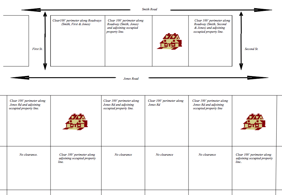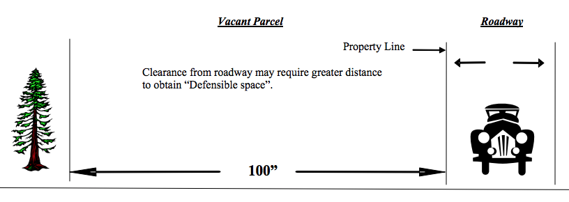 100’ clearance along property lines adjacent to roadways and/or neighboring structures